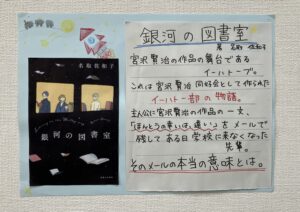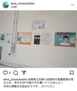 10/20 図書委員が作成した本のPOPや紹介文が尼崎市立中央図書館に展示 図書委員が作成した本のPOPが尼崎市立中央図書館に展示されています。「今回も素敵な作品ですね。」と褒めて頂きました。来館された際は是非、ご覧下さい。 FacebookX投稿日: 2025年10月20日