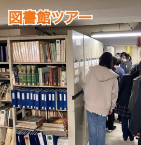 ツアー前半は、普段入ることのできない書庫の見学をしました。書庫には膨大な数の本があり、圧巻でした。とても古い雑誌や新聞も保管されていて、貴重な資料を見せて頂きました。電動で動く本棚に、みんな驚いていました。