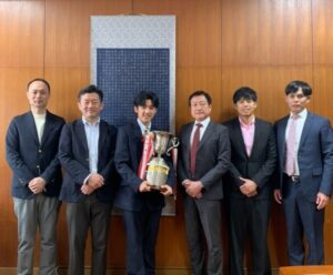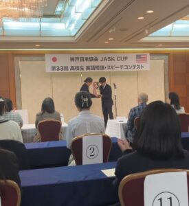 【快挙】去る1月25日(日)、神戸市日米協会主催の第33回高校生英語暗誦・スピーチコンテストにおいて、本校国際探求学科の生徒が見事優勝し、JASK CUP AWARD(会長賞)を受賞しました。昨日協会の方々が優勝トロフィーを持参されました!!